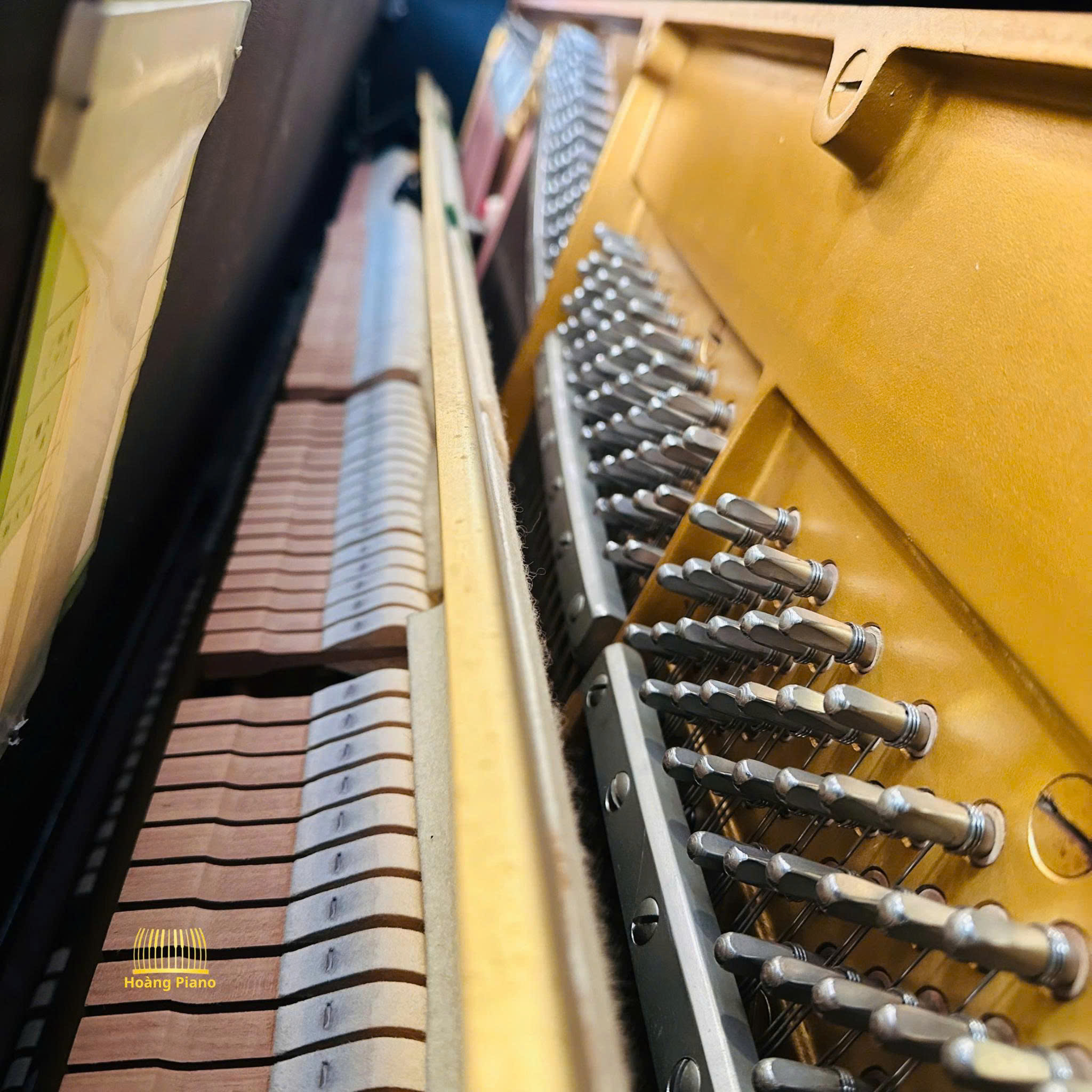 Máy đàn phía trong đàn là một tổ hợp liên kết của các bộ phận nhỏ lại với nhau. Nguyên lý hoạt động giống như đòn bẩy và đặc điểm dễ dàng nhận biết là búa đàn. Và điều lưu ý ở đây, hầu hết các chi tiết trong máy đàn đều được chế tạo thủ công và bằng gỗ nên rất nhảy cảm với nhiệt độ và độ ẩm.